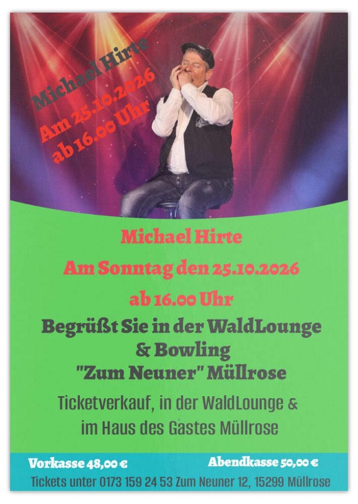 Michael Hirte kommt, in die Waldlounge und Bowling Zum Neuner in Müllrrose, am 25.10.2026. Beginn ab 16 Uhr